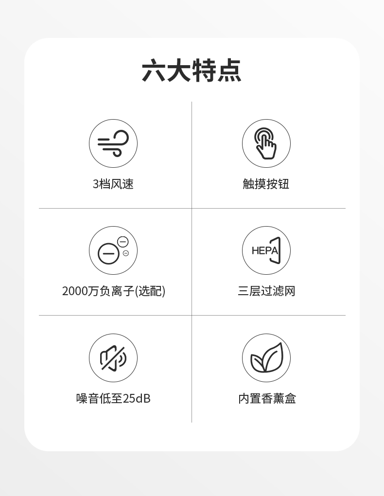 2000萬負離子:持續釋放負離子,能夠結合空氣中的微塵、花粉、黴菌、煙霧等有害物質,同時中和空氣中的有機氣體分子,有效淨化空氣。適量的負離子還能刺激人體產生有益的生理反應,如增強免疫力、改善睡眠質量和減少疲勞,有助於提升整體健康水平。此外,負離子能夠促進體內血清素的分泌,提升人體的情緒狀態,減少壓抑和焦慮感。