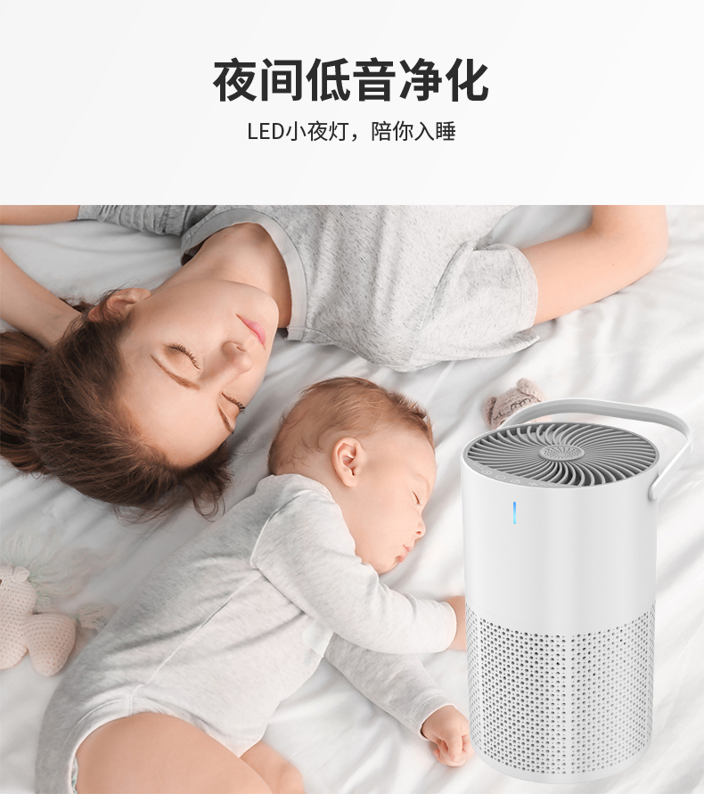 安靜運行:三檔可調節風速,可定時淨化。睡眠模式噪音低至25分貝,在淨化空氣的同時,守護您的寧靜。