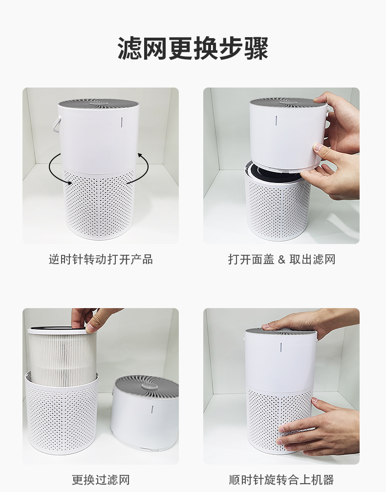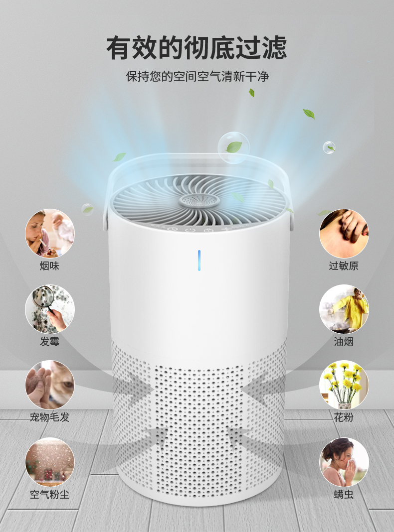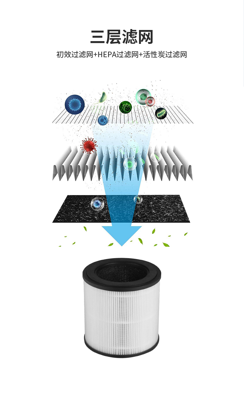 三層濾網:初效過濾網+HEPA過濾網+活性炭過濾網,層層過濾,能夠吸收異味、煙霧和甲醛,有效去除99.99%以上的灰塵、花粉和PM2.5。